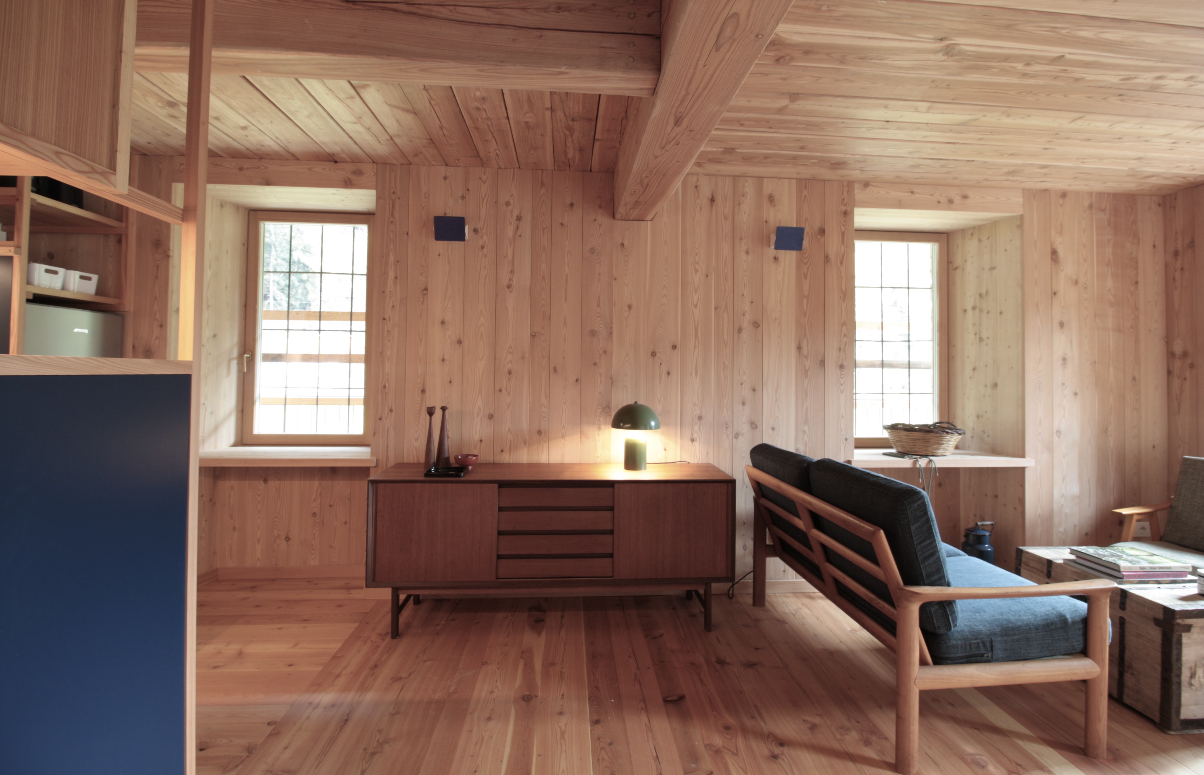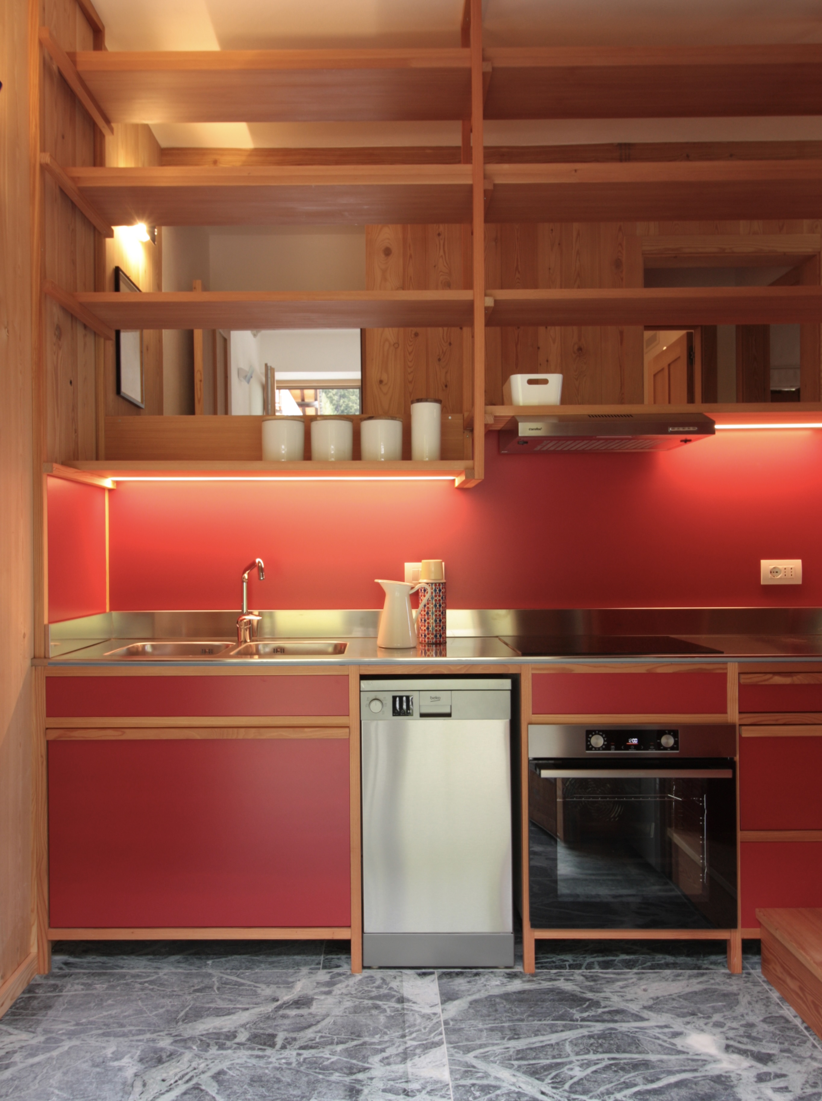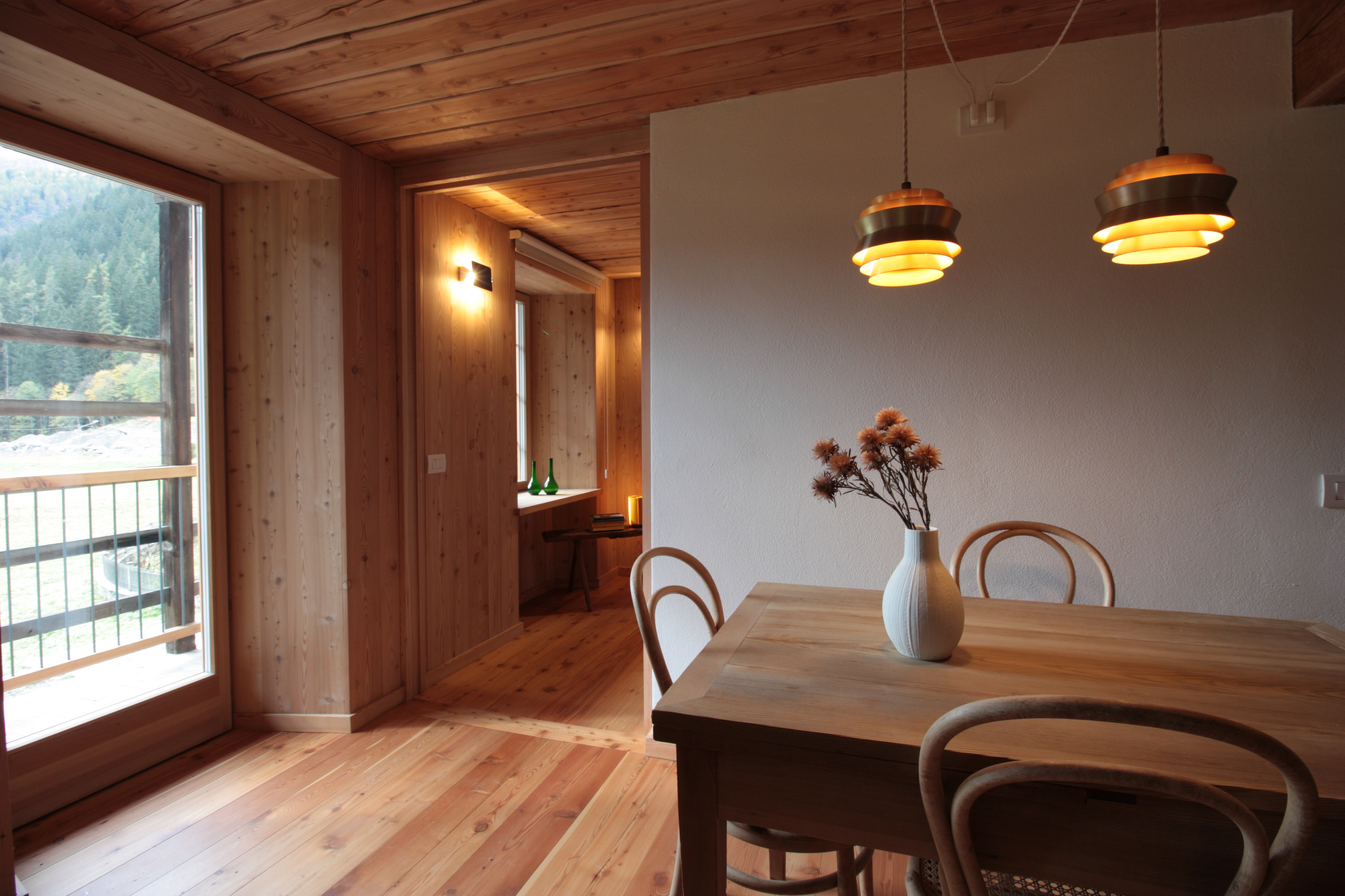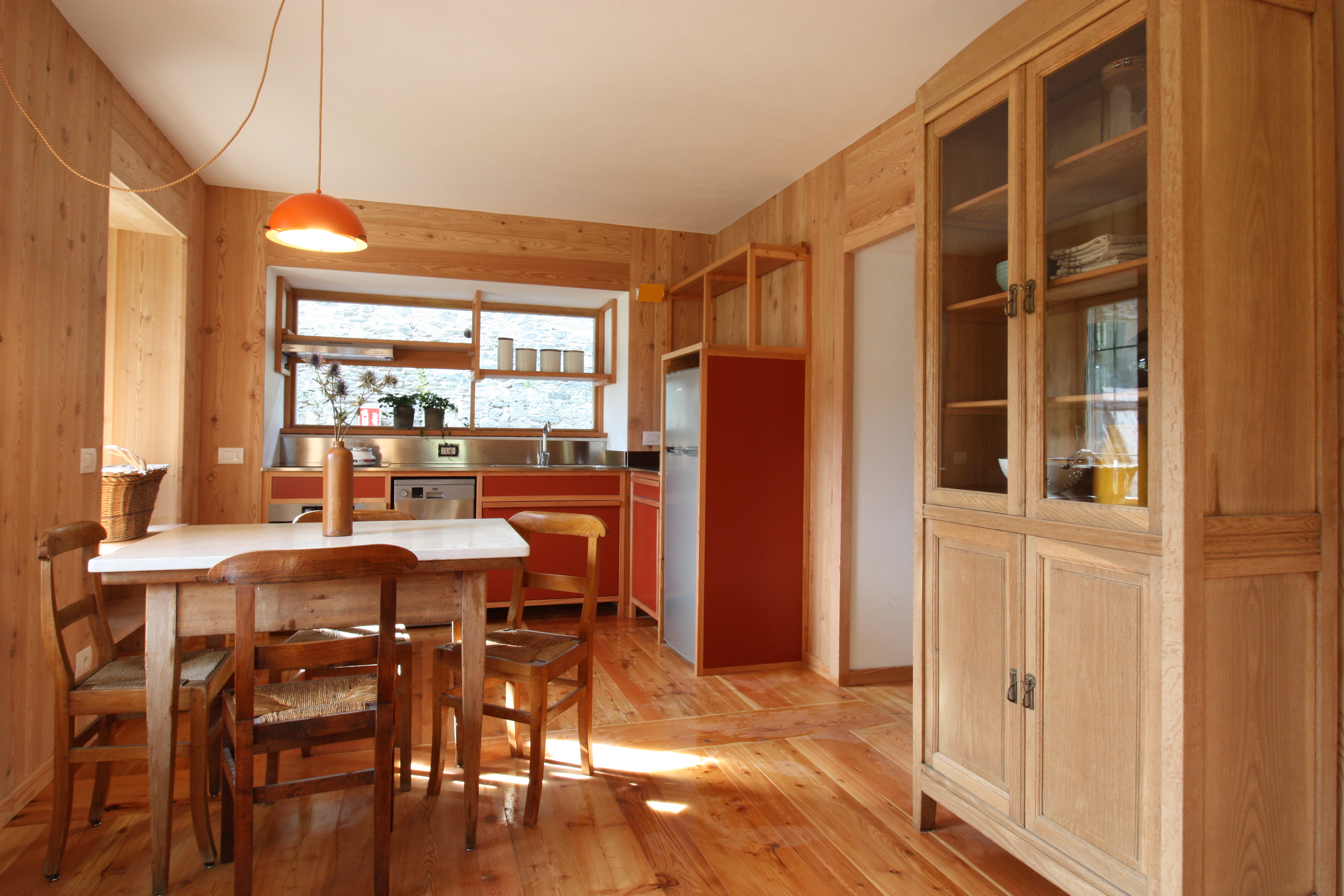 Furthermore the renovation of both the stable and the adjacent chalet are entirely done using onsite and local materials, such as the interior wood has been sliced from the original stable floors and the stone of the entrances and kitchen floors carved in the local quarry.